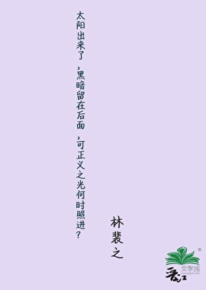 太陽出來了,黑暗留在后面,可正義之光何時(shí)照進(jìn)? 題目出自曹禺的《日出》。 第一人稱。 |